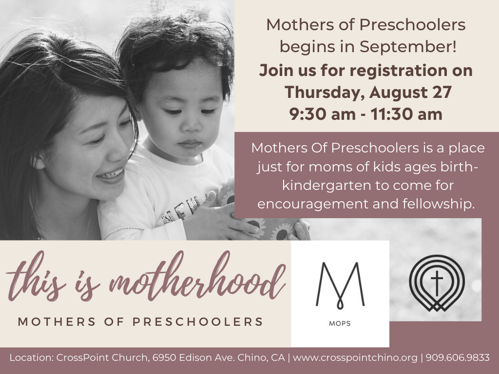 MOPS is led by mothers and is designed to meet the needs of mothers with children ages birth through kindergarten. Gatherings include breakfast, followed by a speaker, game, creative activity or projects. There are also small discussion groups where moms have opportunities to share hopes, fears, ideas, and experiences with other moms, all while the children are being cared for in Mops Kids. Registration Required. For information, contact mops@crosspointchino.org or join us at our registration event!